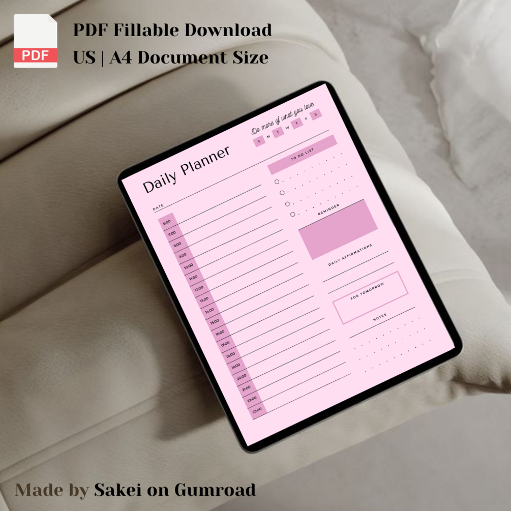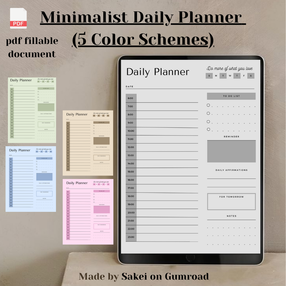 Introducing the Minimalist Daily Planner Fillable PDF, a sleek and functional tool designed to streamline your day with effortless elegance. Available in five assorted colors, this digital planner offers a touch of personalization to match your style while maintaining a clean, uncluttered design.